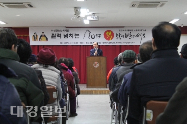 의성군노인복지관은 1일 김주수 군수를 비롯한 최유철 군의장, 최태림 도의원, 김정업 운영위원장, 내빈과 회원, 주민 200여 명이 참석한 가운데 건강을 기원하는 2017년 새해 ‘복’ 나누기 행사를 가졌다.이날 의성어린이집 원아들은 어르신들께 건강을 기원하는 새해인사와 복주머니를 전달하고, 깜찍한 댄스공연이 펼쳤다.