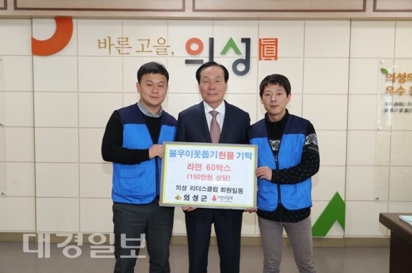 의성군 리더스클럽이 15일 군청을 방문해 김주수 군수에게 관내 어려운 이웃들에게 전해달라며 '사랑의 라면' 60상자를 기탁했다.이날 김주수 군수는 어려운 시기에 젊은분들이 지역을 생각하며 따뜻한 사랑을 전해 준 최상호 회장과 회원분들께 감사의 뜻을 전했다.