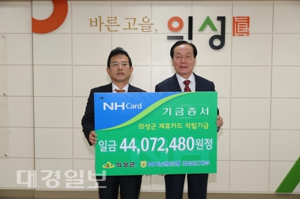이번 적립기금은 의성군과 NH농협은행 의성군지부가 2006년부터 협약을 맺고 총 3억7백만원을 군청공무원이 사용하는 맞춤형 복지카드와 보조금을 지원받는 보조사업자가 사용하는 보조금전용카드, 군이 사용하는 법인카드 사용액의 0.3~1%가 적립된 것이다.