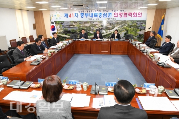 중부내륙중심권 의정협력회(회장 단양군의회의장 조선희)가 주관하고, 영주시의회가 주최하는 이번 정기회는 영주시를 비롯해 경북 봉화군, 충북 제천시, 단양군, 강원 영월군, 평창군 등 3도 6개 시·군 의장, 부의장, 관계 공무원 등이 참석해 ‘2016년 결산 및 주요안건’을 협의했다.