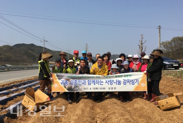 이번 행사는 감문면 귀농·귀촌인 멘토링제의 멘토 및 멘티 30명이 참석해 약 1,500㎡ 면적의 휴경지를 정리한 후, 밭 두둑에 감자를 심고 비닐을 씌우는 작업을 했다.