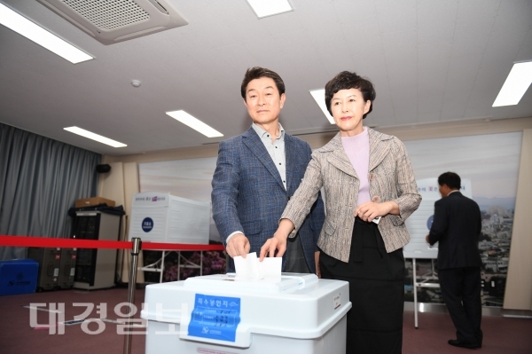 ▲ 영주시 제공장욱현 영주시장은 지난 4일 영주1동행정복지센터 1층 회의실에 마련된 사전투표소에서 부인 권정희 여사와 함께 제19대 대통령 선거 사전투표 후 투표소 종사자들을 격려했다.장시장은 “국민의 소중한 권리를 행사하는 선거인 만큼 모든 시민이 투표에 참여해 주길 바란다”고 투표 참여를 독려했다.