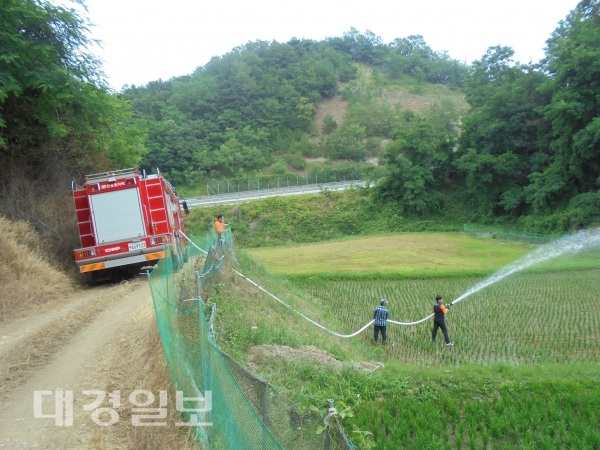 한울원전은 울진군(북면 면사무소)과 합동으로 주변지역 농가에 긴급 농업용수를 지원키로 결정하고, 1차 대상지로 부구2리 산골에 위치한 농작지를 선정하여 소방차를 출동시켰다.