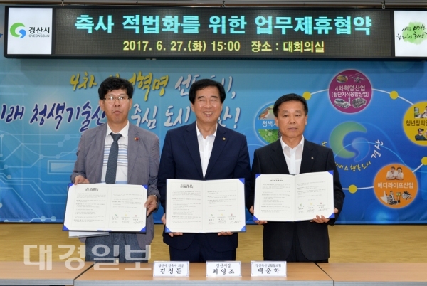 또 지난달 27일 경산시와 경산축산업협동조합, 경산시건축사회 간 축사 적법화를 위한 업무제휴 협약도 체결했다. 이번 업무협약 체결로 축산농가에서는 축사 양성화를 위한 무료컨설팅, 양성화에 필요한 설계비용도 30%정도 절감할 수 있게 됐다.