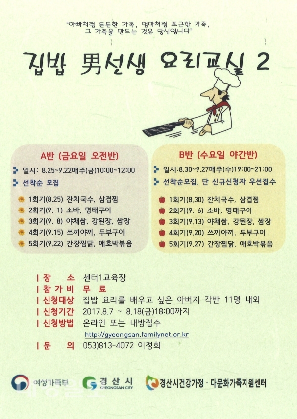 선착순으로 모집하며 신청은 7일부터 오는 18일까지 온라인(gyeongsan.familynet.or.kr) 또는 방문해 접수하면 된다.