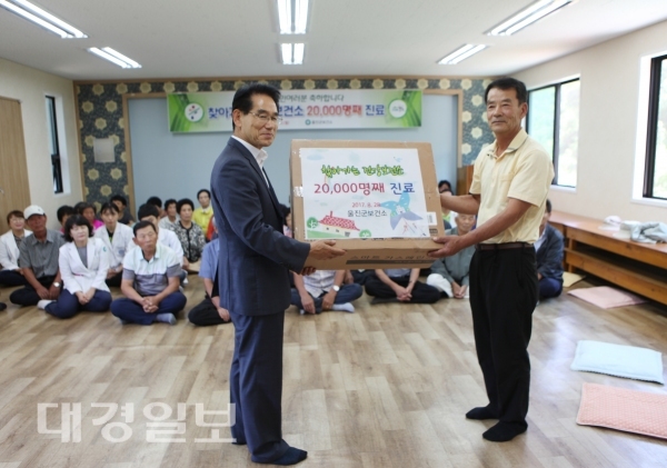 찾아가는 건강보건소 사업은 의료취약지역인 오지에 거주하는 지역주민들에게 큰 사랑을 받고 있으며, 2013년 4월 발대식을 가지고 근남면 구산리에서 첫 진료를 시작해 이날 금강송면 하원리에서 2만명째 진료 기록을 달성하게 됐다.