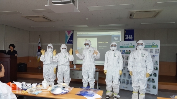 이번 훈련은 개인보호복(Level D) 착·탈의법 동영상 시청 후 보호복, 덧신, N95마스크, 이중장갑, 고글 등 전 직원이 직접 체험함으로서 메르스 등 감염병위기 상황 시 감염병 확산 방지 및 신속한 대처 능력을 향상하고 감염병으로부터 의료인을 보호하기 위하여 실시했다.