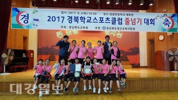영덕야성초등학교는 지난 2일 경산성암초등학교에서 열린 2017경북학교스포츠클럽줄넘기대회에 참가해 종합 준우승이라는 성과를 거뒀다. 영덕/박기순 기자 rltns1120@hanmail.net 다른기사 보기 저작권자 © 대경일보 무단전재 및 재배포 금지 당신만 안 본 뉴스 李대통령 “성과는 충분”… 재계 “국내 투자 확대하겠다” 신천지자원봉사단 대구지부, 대명역·관문시장 환경정화활동 실시 [부서탐방] 지역발전 대동맥...사통 팔달 교통망 확충 앞장 ‘구미시 도로 철도과’ 튀르키예서 독일인 일가족 숨져… 길거리 음식인가, 호텔 오염인가 [단독] 수능 끝났는데도 1시간가량 ‘대기’… 포항 두호고 수험생들 불만 ‘AI 버블’ 경계·美 금리 불확실성… 코스피 4000선 무너졌다 유재춘 이사장, 국회에 새마을금고 규제 완화 건의 李대통령 “성과는 충분”… 재계 “국내 투자 확대하겠다” 댓글삭제 삭제한 댓글은 다시 복구할 수 없습니다. 그래도 삭제하시겠습니까? 비밀번호 닫기 기사 댓글 0 댓글 접기 로그인 후 이용 가능합니다. 댓글 내용입력 비회원 로그인 이름 비밀번호 댓글 내용입력 댓글쓰기 계정을 선택하시면 로그인·계정인증을 통해 댓글을 남기실 수 있습니다. 회원 로그인 비회원 글쓰기 이름 비밀번호 자동등록방지 로그인 옵션 창닫기 주요기사 [이철우 칼럼] 행복을 유예하지 마라 [역사탐방] 일본서 꽃 피운 조선의 음식문화 해병특검, 공수처장·차장 기소··· 국회 위증 사건 방치 혐의 [속보] '6000만원 수수 혐의' 노웅래 전 의원 1심 무죄 與, 대미투자특별법 발의··· 美 관세 11월1일 소급 적용 與, 퇴직 대법관 수임 제한·법원행정처 폐지 추진… 법원 “사법권 침해” 반발