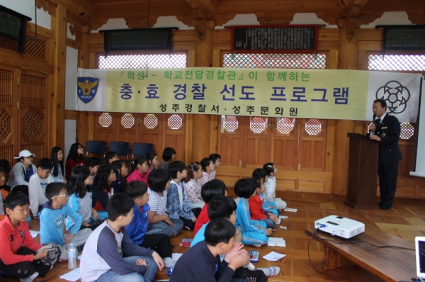성주경찰서는 지난 14일 오전9시30분 성주읍 봉산재(시조공원)에서 벽진면소재 벽진 초등학교 학생 56명을 대상으로 성주문화원과 함께 충·효 경찰 선도 프로그램을 실시했다. 충효 경찰 선도 프로그램은 학교폭력예방의 일환인 인성교육 강화를 목적으로 성주경찰서와 성주문화원이 함께 기획한 청소년 선도프로그램이며 금일 벽진 초등학교 재학생을 대상으로 처음 실시하게 됐다, 학교폭력전담경찰관과 예절강사 문화해설사가 함께 청소년에 대한 예절교육과 학교폭력예방 교육 그리고 군 관내 문화유적지(백세각, 해동청풍비 등)를 함께 탐방하면서 즐거운 시간을 가졌다.