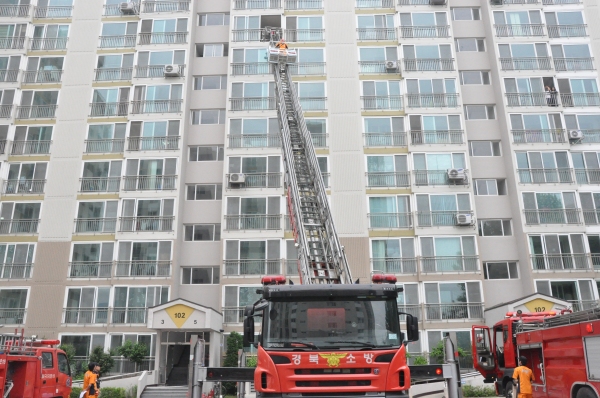 고령소방서는 지난14일 고층건축물 화재발생시 현장 출동대원들의 화재진압전술 향상과 초기대응 능력 강화로 화재피해를 최소화하기 위해 고령읍 소재 디오팰리스에서 화재진압훈련을 실시했다. 이번 훈련에는 소방관 30명을 비롯해 고가사다리차 등 특수 소방차량 8대가 동원돼 건축물의 주요구조 및 피난 로를 파악하고 유사시 자체 소방시설을 활용한 인명구조 대피 및 화재진압 방안을 모색했다. 훈련 이후에는 주민들을 대상으로 각종 재난상황에 대비해 익혀야할 기초 소방상식인 소소심(소화기, 소화전, 심폐소생술) 교육도 함께 이루어졌다. 이날 신성국 대응구조구급과장은 “고층건축물은 화재 발생 시 연기의 확산속도가 빠르고 고가사다리차 전개 높이의 한계로 인명구조 활동에 어려움이 많다”며 “이에 따른 맞춤형 대응 매뉴얼과 철저한 예방대책을 수립해 고층건축물의 사고 대응에 만전을 기하겠다”고 말했다.