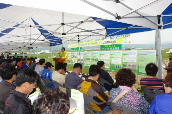 경주시농업기술센터(소장 이태현)에서는 경북도농업기술원과 공동으로 최근 몇 년 간 가을철 잦은 강우와 볏짚 수거 작업이 늦어져 청보리, 호밀 등 동계사료작물을 파종하지 못하거나, 파종 후 생육상태가 불량해 농가들이 많은 어려움을 겪고 있어 이를 해결하고 생산성을 높이기 위해 지난2013년 9월 24일 강동면 오금들 (강동면 오금리 285번지) 10㏊에 무인헬기를 이용한 IRG(이탈리안라이그라스) 벼 입모 중 파종 시험을 추진해 5월 14일 평가회를 개최했다