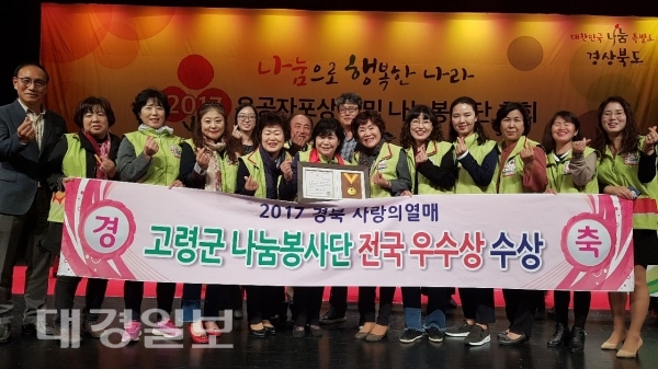 고령군 나눔봉사단은 경북도 2013년 최우수봉사단상, 2014년 우수봉사단상, 2015년 최우수봉사단상을 받았으며, 이번에 전국에서 2017년 우수 봉사단상을 받게 됐다.