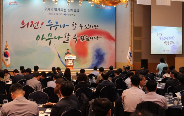 ▲경북도는 지난달 30일 금오산호텔에서 본청, 직속기관 및 사업소, 23개 시․군 직원 등 250여명이 참석한 가운데 ‘2014년 행사의전 실무교육’을 열어 의전현장 사례중심 교육으로 큰 호응을 얻었다.