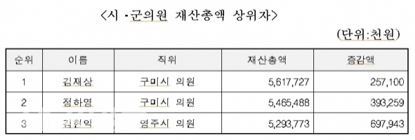 최고 신고자는 김재상 구미시의원으로 56억1천700만원이며, 최소 신고자는 최경환 울릉군의원으로 -8억5천500만원이다.