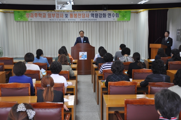 경북도고령교육지원 청은 지난 16일 교육지원 청 3층 회의실에서 관내 초ㆍ중학교 방과 후 학교 외부강사 및 초등 돌봄 교실 전담 사 등 60여명을 대상으로 2014 방과 후 학교 외부강사 및 초등 돌봄 교실 전담 사 역량 강화를 위한 연수회를 개최했다.
