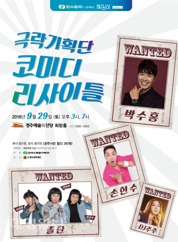 한수원과 함께하는 문화가 있는 날 시리즈 9, ‘극락기획단(코미디 리사이틀)’은 내달 3일 오전 10시 경주예술의전당 홈페이지 및 인터파크 티켓을 통해 오픈한다. R석 5만원, S석 4만원으로 경주시민 및 경주 소재 재학생 및 기업의 직원은 신분증이나 증빙자료를 제시하면 전석 2만원에 관람이 가능하다. 자세한 정보는 경주예술의전당 홈페이지(www.gjartcenter.kr)에서 확인할 수 있다.