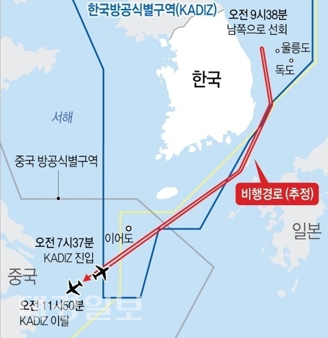 합참에 따르면, 중국 군용기는 이어도 상공의 KADIZ에 진입한 후 대한해협의 KADIZ 접경을 따라 진입과 이탈을 반복하며 동해로 이동했다.