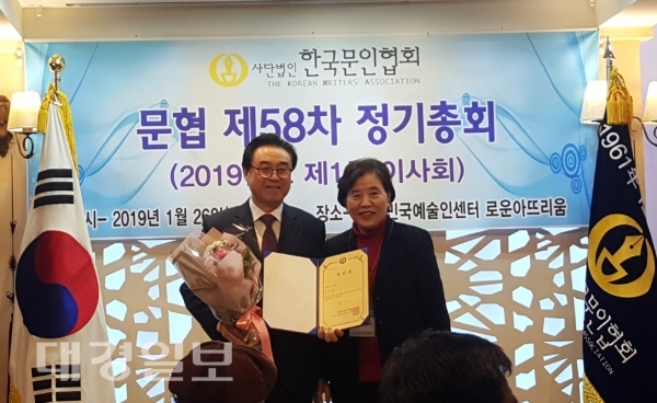 ▲ 정영자 선관위원장으로부터 부이사장 당선증을 받고 있는 권갑하 시인국내 최대 문학 단체인 (사)한국문인협회는 지난 26일 대한민국예술인센터에서 제58차 정기총회를 열고 제27대 임원선거 개표결과 부이사장에 문경 출신 권갑하 시인이 당선의 영광을 안았다.