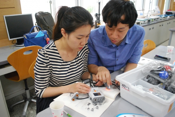 ▲경주의 새로운 체험학습장으로 활용되고 있는 경주과학발명교육센터에서 지역 초등 교원 20명이 참가하는 ‘2014 초등교원 로봇프로그래밍 직무연수’ 개강식을 가졌다.사진은 참가한 한 교사가 지도교사의 지도에 로봇에 관련된 실험을 하고 있다. |