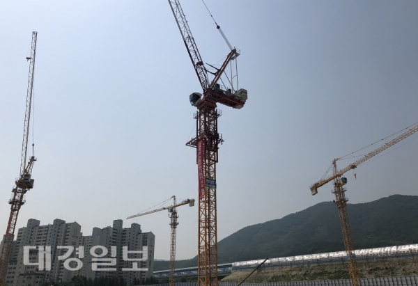 수성구 한 아파트 공사현장에 있는 타워크레인 5대 가운데 4대에는 '시한폭탄 소형 타워크레인 즉각 폐기' 등 구호가 적힌 현수막이 걸려 있었다.