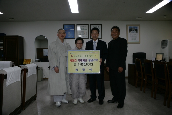 성주군성주읍 소재 임정사 성우 주지스님이 지난 20일 성주군를 방문해 세월호 침몰사고 피해지원에 써달라며 성금 100만원을 기탁했다. 성우스님은 “이번 세월호 침몰 사고 희생자와 학부모들에게 깊은 애도를 표한다”며 “피해자 가족 분들과 슬픔을 함께 나누고 조금이나마 위안이 되려고 마음을 모았다”고 말했다.