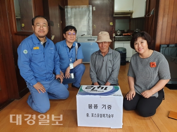 이날 물품은 포스코 설비부분 직원들이 십시일반 돈을 모아 샴푸, 비누 등의 필요한 생필품을 구입해 포장하고 대상자에게 직접 전달했다.