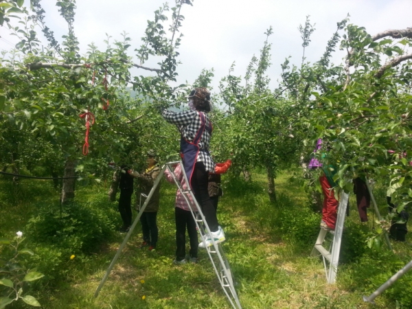 이날 일손돕기에 참여한 직원들과 문화예술단체 회원들은 사과적과, 잡초제거 등을 실시했으며 일터에서 농민들과 식사를 함께하며 농업현장의 애로사항을 청취하고, 농촌 지원방안에 대해 의견을 나누는 시간을 가지기도 했다.