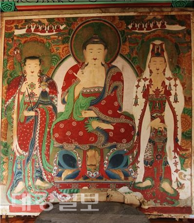 이번에 지정 예고된 아미타삼존도는 화면 중앙에 아미타여래를 중심으로 좌측에는 관음보살, 우측에는 지장보살이 시립(侍立)하고 상단 좌우측에 합장을 한 10위의 타방불이 연화대좌에 앉아있는 비단 바탕에 채색된 불화로 고려 말 조선전기의 아미타삼존설법도 형식을 계승하고 있는 중요한 작품이다.