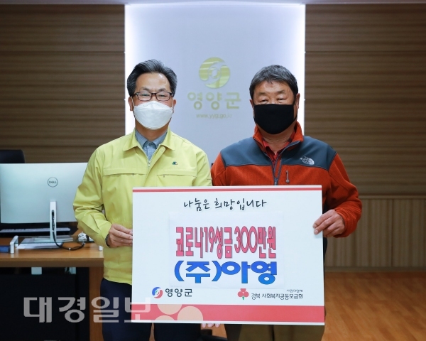 ㈜아영(대표 이유도)은 지난 8일 영양군청을 방문해 300만원의 성금을 기탁하며 코로나19 극복에 동참했다. 임범규 기자 bk8824@hanmail.net 다른기사 보기 저작권자 © 대경일보 무단전재 및 재배포 금지 당신만 안 본 뉴스 李대통령 “성과는 충분”… 재계 “국내 투자 확대하겠다” 신천지자원봉사단 대구지부, 대명역·관문시장 환경정화활동 실시 [부서탐방] 지역발전 대동맥...사통 팔달 교통망 확충 앞장 ‘구미시 도로 철도과’ 튀르키예서 독일인 일가족 숨져… 길거리 음식인가, 호텔 오염인가 [단독] 수능 끝났는데도 1시간가량 ‘대기’… 포항 두호고 수험생들 불만 ‘AI 버블’ 경계·美 금리 불확실성… 코스피 4000선 무너졌다 유재춘 이사장, 국회에 새마을금고 규제 완화 건의 李대통령 “성과는 충분”… 재계 “국내 투자 확대하겠다” 댓글삭제 삭제한 댓글은 다시 복구할 수 없습니다. 그래도 삭제하시겠습니까? 비밀번호 닫기 기사 댓글 0 댓글 접기 로그인 후 이용 가능합니다. 댓글 내용입력 비회원 로그인 이름 비밀번호 댓글 내용입력 댓글쓰기 계정을 선택하시면 로그인·계정인증을 통해 댓글을 남기실 수 있습니다. 회원 로그인 비회원 글쓰기 이름 비밀번호 자동등록방지 로그인 옵션 창닫기 주요기사 [이철우 칼럼] 행복을 유예하지 마라 [역사탐방] 일본서 꽃 피운 조선의 음식문화 해병특검, 공수처장·차장 기소··· 국회 위증 사건 방치 혐의 [속보] '6000만원 수수 혐의' 노웅래 전 의원 1심 무죄 與, 대미투자특별법 발의··· 美 관세 11월1일 소급 적용 與, 퇴직 대법관 수임 제한·법원행정처 폐지 추진… 법원 “사법권 침해” 반발
