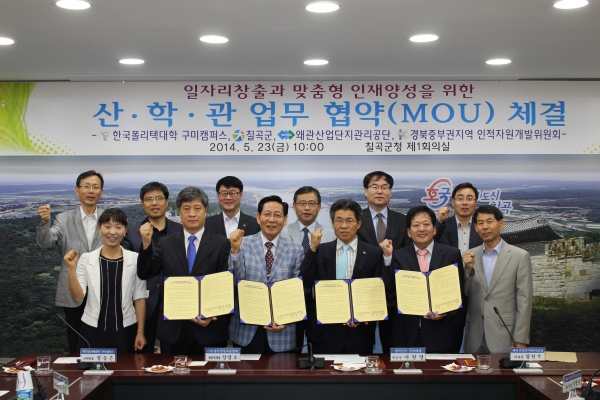 칠곡군은 지난 23일 일자리창출과 맞춤형 인재양성을 위한 ‘산·학·관 업무 협약(MOU)’을 한국폴리텍대학 구미 캠퍼스(학장 송요선)와 경북중부권지역 인적자원개발위원회(위원장 고병헌), 왜관산업단지관리공단(이사장 황천석)과 체결했다.