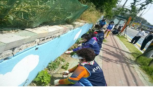 영일대 벽화가 그려진 담장 아래 제멋대로 자란 잡초를 말끔히 제거하고 그 자리에 담쟁이 넝쿨을 심었다.