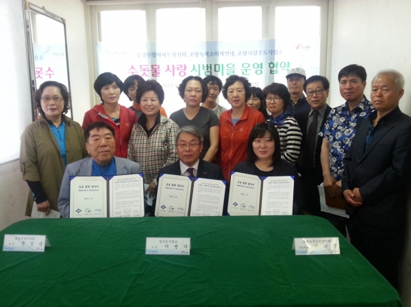 포항시상수도사업소는 27일 유강우방타운 관리사무소에서 유강우방타운(입주자대표회장 문정웅)과 포항녹색소비자연대(상임대표 문숙영) 관계자가 참석한 가운데 ‘수돗물 사랑마을’ 운영 협약식을 가졌다.