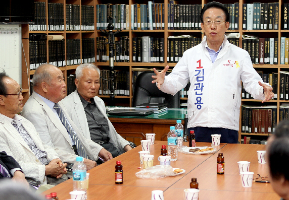 사진 설명 : 김관용 후보가 27일 안동향교회관을 방문해 지역의 유림들과 청소년교육에 관해 이야기를 나누고 있다.