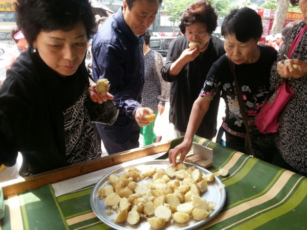 고령군 개진면 개진감자영농조합(대표 이용석)은 지난28일동대구농협 본점 하나로 마트 앞에서 고령감자 직판행사를 가졌다. 이번 행사는 오는6월 본격적으로 노지 감자가 출하 될 시점에 최대 출하 처 동대구농협의 요청에 의해 옛 부터 명성이 높은 고령감자를 가마솥에 삶아 맛으로 직접 확인해 대구 주부 소비자들로부터 큰 인기를 얻었다. 고령감자는 개진면이 전국 최고의 봄 감자 주산지이며 4월중 하우스 감자가 출하됐고 6월초 노지 감자가 출하되며 군 전체 318ha 재배면적에 8,500톤 정도가 생산될 예정이다. 낙동강변의 사질양토에서 재배돼 알이 굵고 색깔이 희며 전분 및 식이섬유 함량이 높아 맛이 담백하며 저장성이 우수한 품질 특성으로 2013년도 12월 국립농산물품질관리원의 지리적 표시제 93호로 등록돼 고령군 특산물임이 증명됐다. 이번 행사 감자는 하우스감자로 행사를 가졌으며 오는 6월 2일부터 개진면 부리소재 개진감자영농조합 직판장을 6월말까지 운영해 직접 감자를 구입할 수 있으며 군 대표 쇼핑몰인 고령몰(http://www.grmall.co.kr)에서도 택배 신청을 받고 있다.