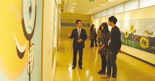 ▲▲(사진설명) 포스코 포항제철소가 직원들의 재능기부로 그려진 벽화들을 전시하는 ‘아름다운 동행, 행복을 그리다’ 작품전을 개최한다. 사진은 관람객들이 주임커뮤니티 직원들의 작품 설명을 듣고 있는 모습. |