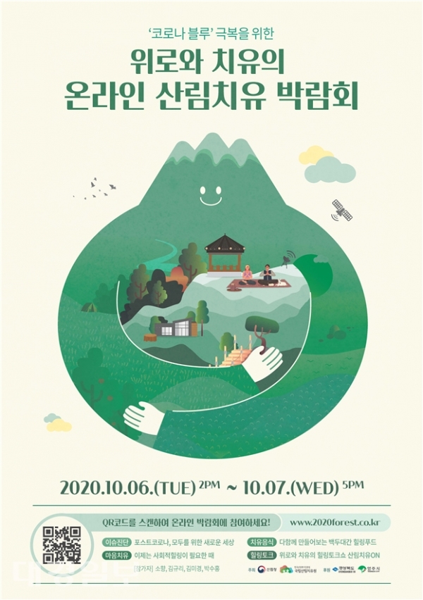최대진 경상북도 환경산림자원국장은 “온라인 산림치유박람회가 코로나로 지친 몸과 마음을 위로하고 치유하는 시간이 될 것으로 기대되며, 국민 모두가 건강하고 활기가 넘치는 일상으로 이어지기를 바란다”라고 밝혔다.