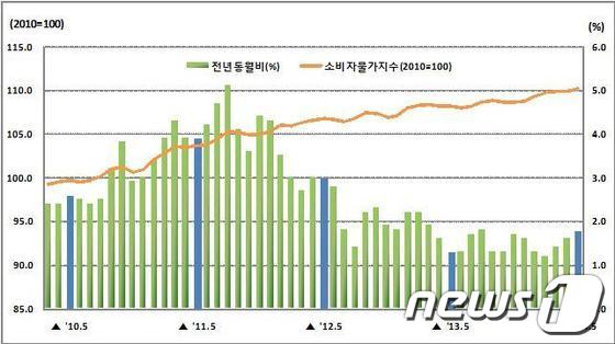 신선식품물가지수는 전년 동월 대비 5.7% 하락했으나 생활물가지수가 1.3% 상승했다.