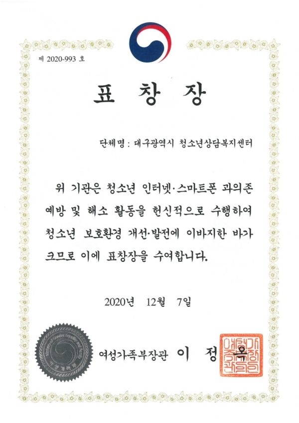 대구청소년지원재단 청소년상담복지센터는 여성가족부 주관 2020년 청소년 인터넷·스마트폰 과의존 예방·해소 사업 평가에서 우수기관으로 선정돼 여성가족부 장관 표창을 수상했다.