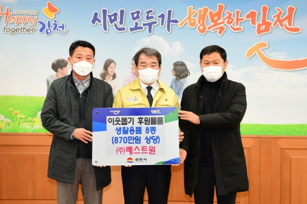 ▲ 베스트원은 김천시을 방문해 후원물품을 기탁하고 기념촬영을 하고 있다/김천시 제공 ㈜베스트원은 지난 8일 김천시청을 방문해 각티슈,롤휴지 등 870만원 상당의 생필품 8종을 기탁했다. 김인섭 베스트원 이사는 “코로나 19로 모두가 힘든 시기에 꼭 필요한 곳에 도움이 되길 바란다”며 “ 앞으로도 지역사회의 소외된 이웃을 돕기 위한 다양한 나눔 활동을 할 것”이라고 말했다. 이날 전달된 물품은 김천 지역 내 노인요양시설 및 장애인거주시설에 전달될 예정이다.