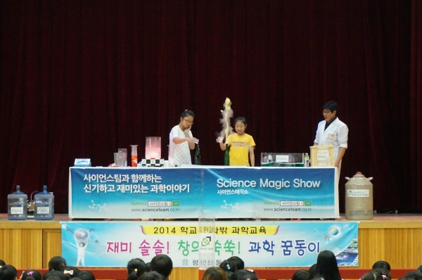 이 날 사이언스 팀 강사는 “초저온 액화질소 체험”,“수면 위의 폭발”,“거품 공장”,“극저온의 세계”등 5가지 주제로 강의와 실험을 마술쇼와 같이 진행하면서 흥미로운 현상을 통해 과학적 원리를 발견하고 과학에 대한 꿈과 희망을 심어 주었다.