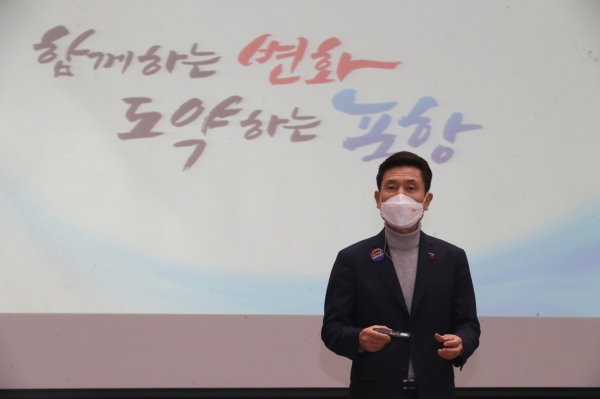 이 시장은 이날 시청 대회의실에서 2021년 시정운영방향에 대한 신년 기자회견을 가졌다. 여태까지는 시청 브리핑룸에서 기자들에게 배부된 자료를 중심으로 읽어나가는 방식이었으나, 이날은 기존의 틀을 깨고 헤드마이크를 사용해 프리젠테이션(PT)을 직접 진행·설명하는 방식으로 진행됐다. 이를 지켜본 기자들은 ‘스티브잡스’를 연상했다고 한다.