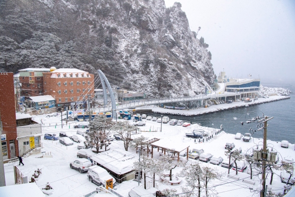 ▲ △폭설로 하얗게 변한 도동항 전경 /울릉군청 제공 ▲ △하얗게 뒤덮인 울릉도 /독자 제공 울릉도가 폭설로 하얗게 뒤덮였다. 매서운 한파와 함께 시작된 폭설은 7일 오후 34㎝의 적설량을 기록하며 섬 전체를 하얗게 물들였다. 대설 발효 및 도로결빙으로 지역 내 버스 운행이 중단됐고 우편물 배달도 지연 또는 중지됐다. 울릉도와 육지를 연결하는 뱃길 또한 강풍과 풍랑경보로 3일째 운항이 중단돼 지역주민과 관광객들이 큰 불편을 겪고 있다. 기상청은 9일까지 5~20㎝가량 눈이 내릴 것으로 예보했다. /울릉군청 제공