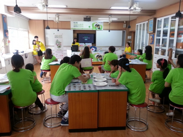▲제 1회 크레파스 꿈나무 글로벌 환경교실이 남경주청년회의소와 크레파스팩토리가 주최해 열린 행사에서 환경김밥이라는 프로그램에 대학생들과 초등학생들이 함께 참가하고 있다.