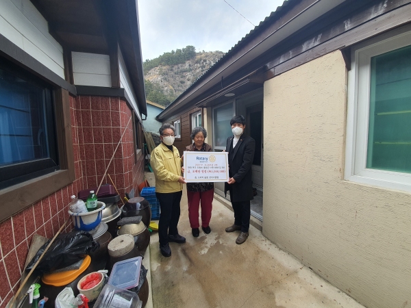울릉로타리클럽은 지난 연말 화재로 인해 소중한 보금자리를 잃어버린 어려움에 처한 이웃의 소식을 전해 들은 국제로타리클럽 3630지구 김상수 총재의 긴급지원으로 화재 복구 지원비 500만 원을 지원받아 피해 가구에 전달했다.