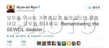 여객선 세월호 침몰 소식을 들은 류현진(27·LA 다저스)이 안타까운 마음을 금치못했다.류현진은 17일 자신의 트위터(@HyunJinRyu99)에 “모두들 무사히 가족품으로 돌아갔으면 좋겠네요. 모두들 힘내세요. Remembering the SEWOL disaster”라는 내용의 글을 올리며 애도의 뜻을 표했다.류현진이 글을 올린 후 다저스의 공식 트위터도 류현진의 글을 번역해 리트윗했다. 지난 16일 제주도로 수학여행을 떠나던 안산단원고등학교 2학년 학생 325명과 교사 14명을 포함해 총 475명을 태운 청해진해운 소속 '세월호'는 전남 진도 해상에 침몰했다. 현재까지 공식 확인된 사망자는 8명, 구조자는 179명, 실종자수는 288명으로 집계됐다.