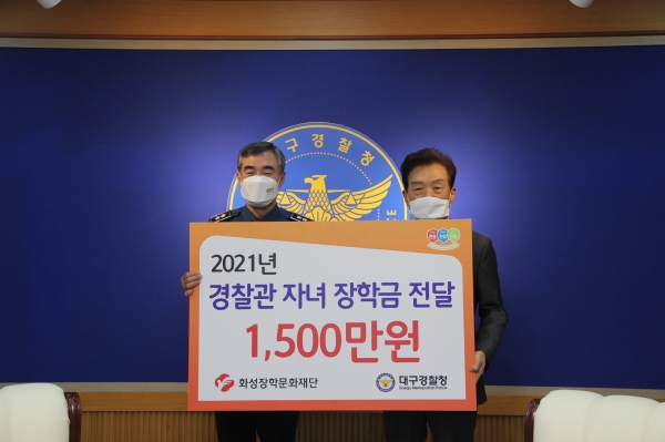 ▲ 좌) 김진표 대구경찰청장 우) 이인중 화성장학문화재단 이사장. /화성산업 제공 화성장학문화재단은 2일 대구경찰청을 방문해 ‘2021 경찰관 자녀 장학금’ 1천5백만원을 전달했다. 화성장학문화재단이 주관하는 ‘경찰관 자녀 장학금’은 지난 1995년부터 매년 지급해 오고 있으며 올해로서 27번째를 맞이한다. 이번에 전달한 장학금은 경찰관자녀의 학업지원에 사용될 계획이다.