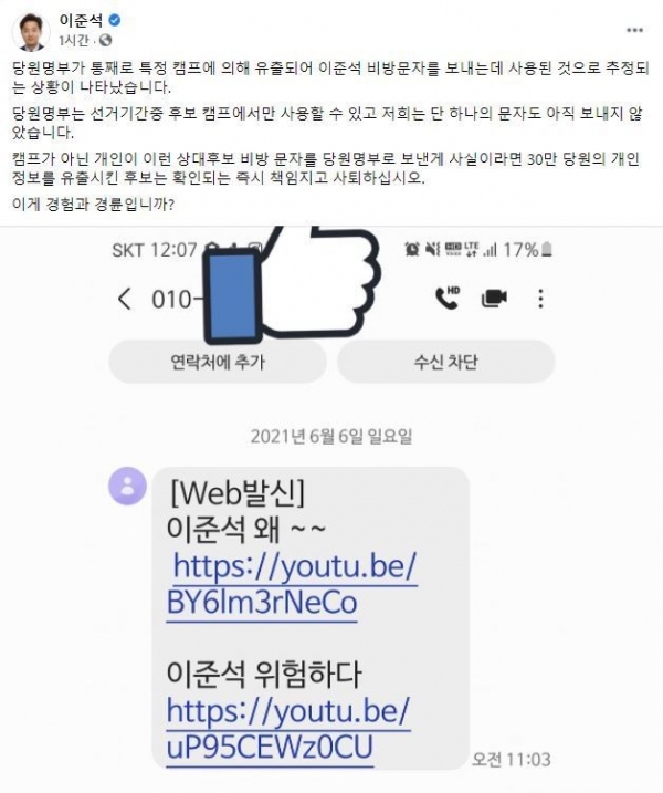 이 후보는 7일 CBS 라디오 김현정의 뉴스쇼에 출연해 "30만명이 넘는 당원에게 노골적인 이준석 비방 내용이 들어간 문자를 뿌린 정황이 발견됐다"라며 "어떻게 당원의 개인 정보를 특정 캠프에서 보수단체 측에다 넘길 수 있나"라고 비판했다.