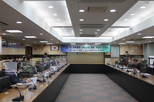 이날 간담회에는 이낙연 전총리, 전혜숙 국회의원, 장세용 구미시장, 윤재호 구미상의회장, 윤성희 부회장(삼성전자㈜ 전무), 문제희 감사(㈜거상 대표이사), 황정학 경제산업분과위원장(비비엔스틸㈜ 대표이사), 김상섭 기획운영분과위원장(상경물산 대표) 등 8명이다.