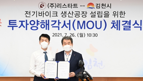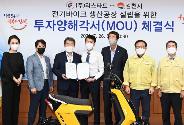 김천시는 26일 시청에서 김충섭 김천시장, 이우청 시의장, ㈜리스타트 정기문 대표 등이 참석한 가운데 전기바이크 생산을 위한 투자양해각서를 체결했다.