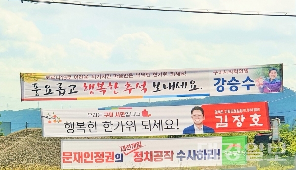 지자체는 이런 상황에도 대시민 추석 인사차 내건 현수막이라 놔두기도 떼기도 껄끄러운 입장이다.